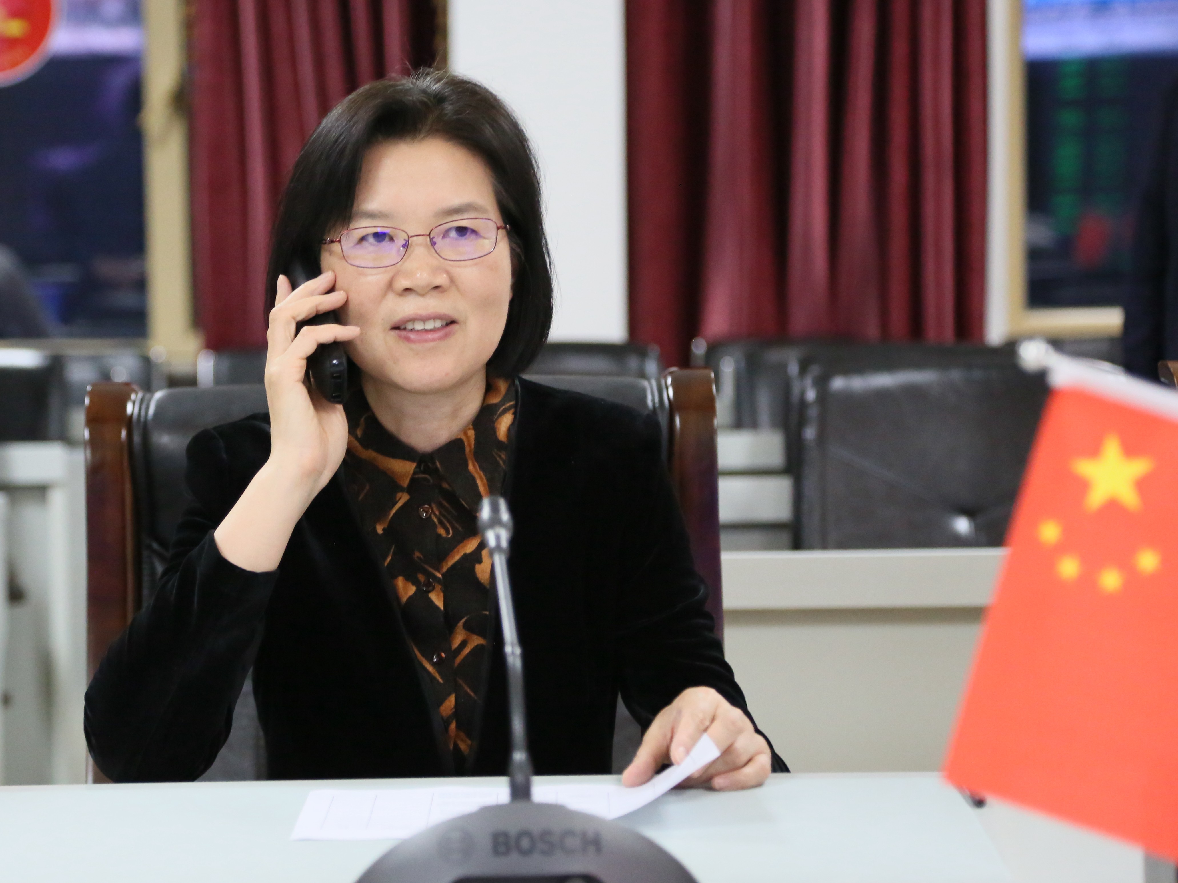 副省长沈莹在集团公司总部调理指挥中连线鸡矿公司新发煤矿井下中央变电所值班职员,并向节日时代坚守岗位的煤矿干部工人致以节日的问候。摄影 闫英群