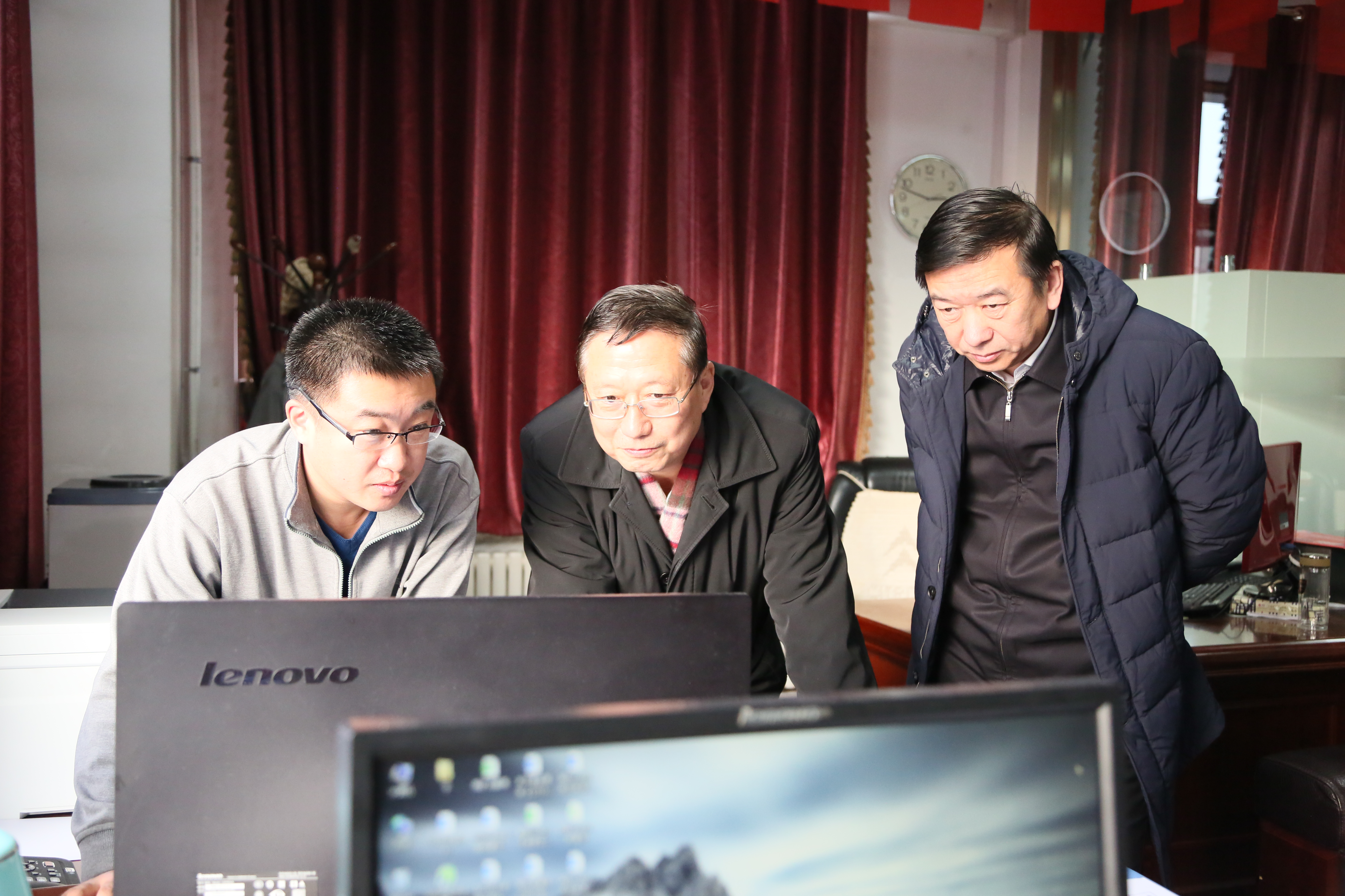 国务院安委会第十五督查组组长、国家煤矿清静监察局副局长宋元明(中)在集团公司生产调理室审查瓦斯监测系统、视频监控系统和生产调理指挥系统运行情形