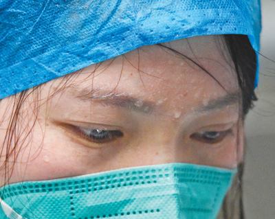 湖南省郴州市嘉禾县人民医院磨练科护士曾梅一连事情6个小时后卸下护目镜。黄春涛摄(影像中国)