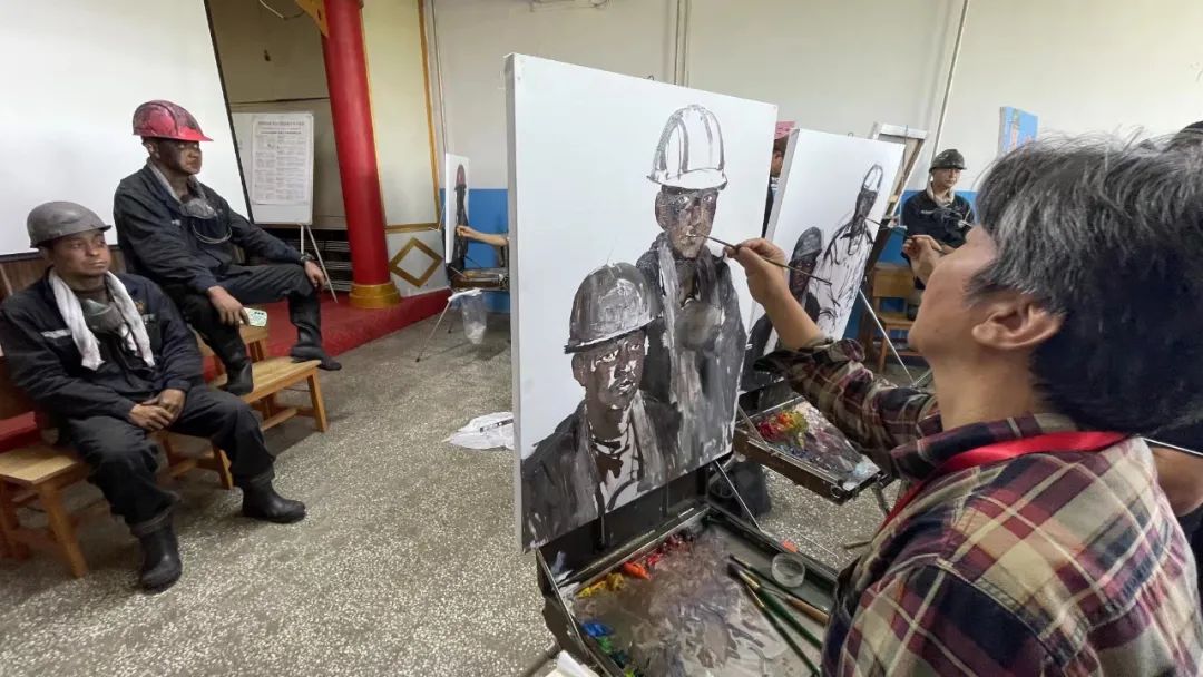 被兴安煤矿厚重的历史文化秘闻以及煤矿工人独具“特色”的风貌所吸引,创作团队15位画家,分为肖像组与外景组迅速进入状态。在兴安矿综采一队,刚刚升井的一线矿工黝黑质朴的脸庞,引发了画家们的创作热情,以一线矿工为模特,短短一上中午间创作出了10余幅肖像油画,展示了今世矿工的风范。