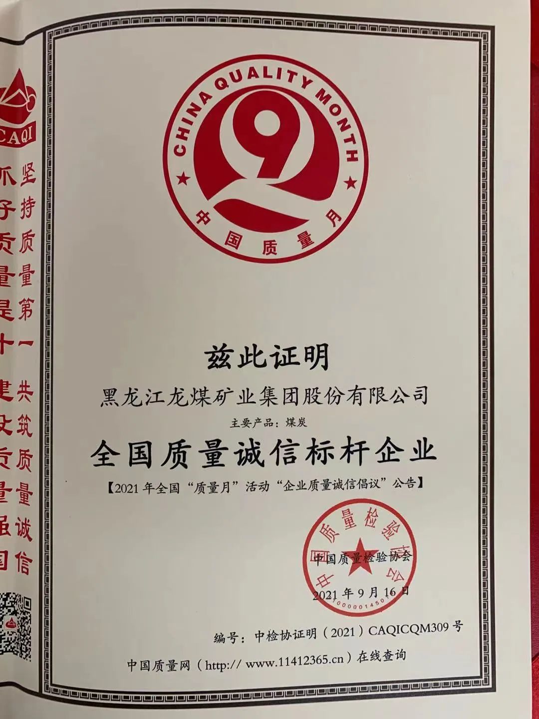 集团公司在中国质量磨练协会举行的《2021年天下“质量月”企业质量诚信建议》专题运动中 ,获得了“天下质量诚信标杆企业”称呼。