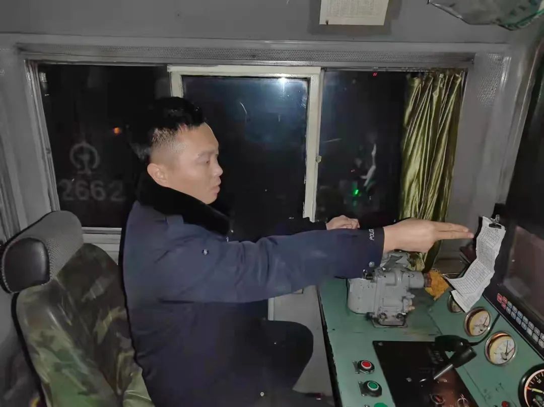 2月1日0时28分,一声风笛长鸣,司机许永明、副司机齐野驾驶0070机车出库,司机许永明一边全神贯注地看着前方,一边用对讲机和车站值班员正在举行出库作业时的对话 。