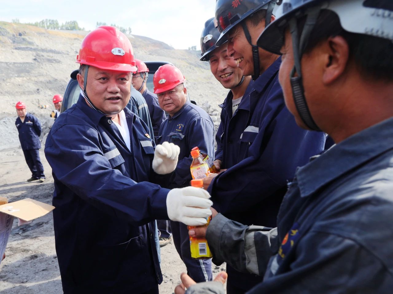 在新岭矿生产作业现场,王戈代表集团公司党委、集团公司向高温天气坚持生产的一线职工体现慰问,并将解暑降温饮品送到职工手中,嘱咐他们要增强自主保安,按规作业,确保清静生产。