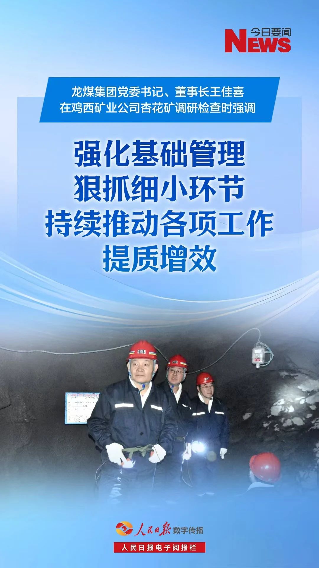 10月28日上午,集团公司党委书记、董事长王佳喜在鸡西矿业公司杏花矿调研检查时强调,要周全落实上级相关事情安排要求,切实增强抓好四序度清静、生产、谋划事情的头脑自觉和行动自觉,深入践行“细节决议成败”事情理念,于基础扎根、于细处着手、于实处发力,强化基础治理,狠抓细小环节,推动各项事情取得新突破、开立异时势,进一步夯实高质量生长基础。集团公司总工程师于会军加入。